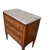 The commode has a marble top, 3 drawers marquetry work on the front and on each side, pulls and the toe cap are brass.